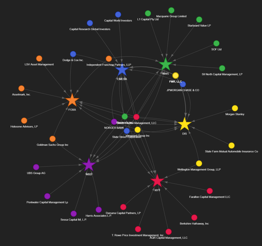 To empirically test this hypothesis, I analyzed the institutional ownership network of six major media conglomerates (NYT, NWS, FOXA, DIS, WBD, CMCSA). Using Python in Google Colab, I queried the yfinance API to extract the top 10 institutional holders for each company, compiling an edge list of 60 ownership ties. I then deployed the networkx library for modeling and PyVis to create an interactive HTML network graph [Chart 1] to visualize the multilateral relationships.