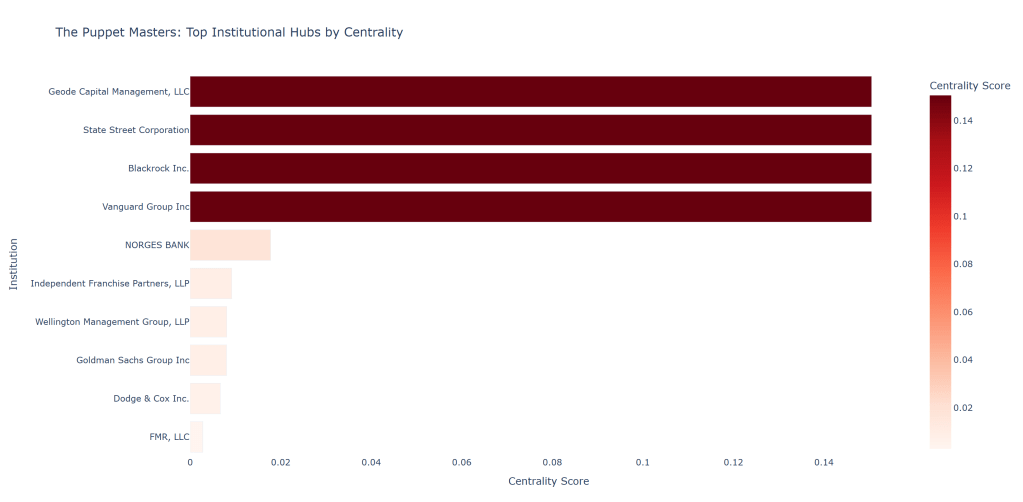 Initial degree analysis of the network graph revealed a striking concentration of capital. Out of a theoretical maximum of 60 distinct institutions, only 18 unique entities control these top positions. To identify the true power brokers, I calculated the Betweenness Centrality of a segmented undirected graph. The resulting power hierarchy bar chart [Chart 2] uncovered a striking phenomenon: The Vanguard Group and BlackRock act as the absolute super-hubs of this media web. Vanguard, BlackRock, State Street, and Geode Capital Management got the highest centrality score (0.1505).