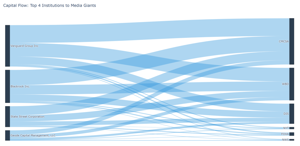 However, network topology only illustrates the existence of connections, not their financial magnitude. Shifting the analytical focus to the actual capital flow, I generated a Sankey diagram [Chart 3] using Plotly to track the exact share volume from the top four institutions to the six media targets. This visualization highlights how massive capital is deployed as weight. The thick flow lines demonstrate that the dominance of Vanguard and BlackRock is not merely structural but backed by overwhelming equity volume, providing them the capacity to heavily influence corporate governance across competing media factions.